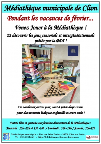 La médiathèque de Clion vous propose de découvrir des jeux sensoriels et intergénérationnels prêtés par la Bibliothèque Départementale de l'Indre pendant les vacances de février !