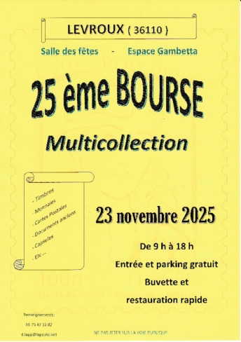- Levroux (36110) Le club philatélique de Levroux organise le 23 novembre 2025 sa 25 ème bourse multicollection : timbres, cartes postales anciennes, monnaies, vieux papiers, capsules, etc...