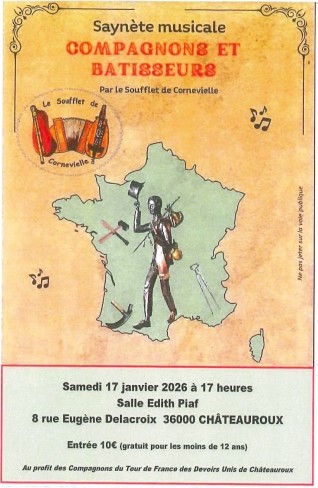 - Châteauroux (36000) Le soufflet de Cornevielle vous propose une saynète musicale "compagnons et bâtisseurs". Accordéons, cornemuses et vielles vont résonner tout au long de ce spectacle qui vous fera voyager autant que les compagnons du tour de France.