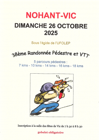 - Nohant Vic (36400) ATTENTION IL S'AGIT D'UNE RANDONNÉE PÉDESTRE UNIQUEMENT Inscriptions et départs de 7 heures 30 à 9 heures de la salle des fêtes de Vic. 5 parcours proposés de 7 - 10 - 14 - 16 ou 18 km. 38eme édition avec 50 à 75 % de chemins.