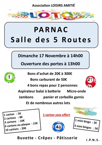L' association Loisirs-amitié de Parnac organise son deuxième loto de l'année le dimanche 17 novembre à la Salle des fêtes des 5 Routes. Ouverture des portes à13h et début du loto à 14h.