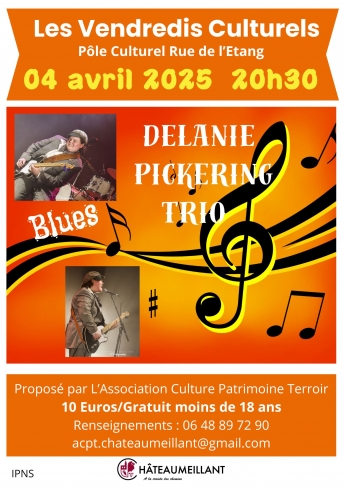 Dans le cadre des vendredis culturels, l’association Culture Patrimoine Terroir de Châteaumeillant recevra Delanie PICKERING pour un concert de blues à Châteaumeillant au pôle culturel de l’étang Merlin le vendredi 4 avril à 20h30.