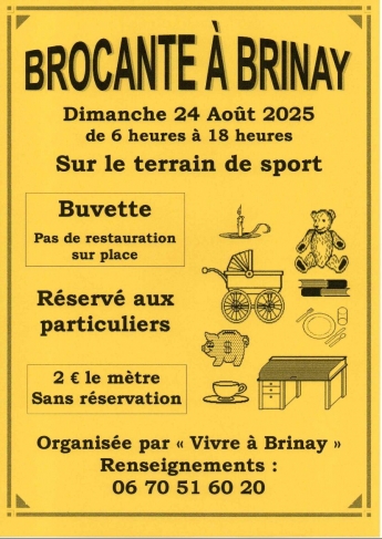 L'association "Vivre à Brinay" organise une brocante réservée aux particuliers le dimanche 24 août 2025 de 6h à 18h sur le terrain de sport.