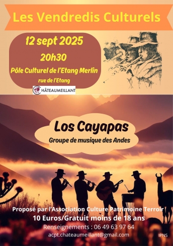 Au pôle culturel de l'Etang Merlin à Châteaumeillant 18370 vendredi 12/09/2025. Concert de Los Cayapas, 4 musiciens et chanteurs qui vous emmènent dans un voyage musical au cœur de la cordillère des Andes au son des flûtes de pan, des kenas et autres instruments typiques.