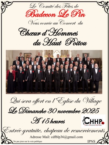 Le comité des fêtes de Badecon le Pin vous invite à venir écouter le Chœur d'Homme du Poitou qui se produira en l'Eglise de Badecon le Pin à 15 heures,