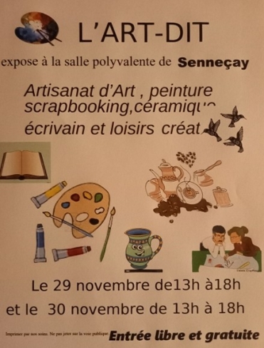 L'incontournable exposition ,depuis bientôt deux decennies le dernier week end de novembre aura lieux à la salle des fêtes de Senneçay 18340. Conviviale et de qualité ,vous allez admirer du scrap, de la céralique d'art , différentes technique de peintures et les dédicaces des écrivains qui présentent leurs derniers ouvrages .A Bientôt à LART'DIT.