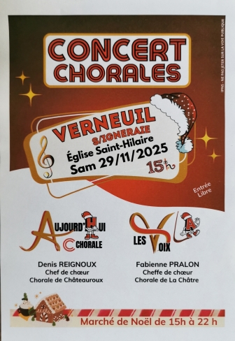 Ne manquez pas le magnifique concert de nos deux chorales Les Voix La de la Châtre et Aujourd'hui C Chorale de Châteauroux pour l'ouverture du Marché de Noël de Verneuil/Igneraie le 29/11 à 15 h. Un concert gratuit au répertoire varié et éclectique. C'est l'assurance d'une excellente après-midi !
