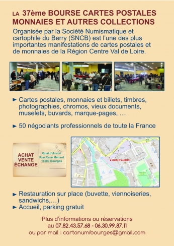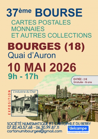 Dimanche 10 mai, les cartophiles, numismates et autres collectionneurs sont invités par la Société numismatique et cartophile du Berry à Bourges pour la 37ème bourse cartophile, numismatique et autres collections.